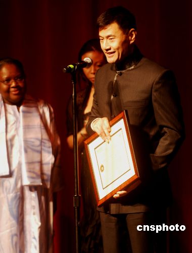 中美電影節(jié)十一月一日晚在好萊塢美國導(dǎo)演公會開幕,聯(lián)合國兒童機(jī)構(gòu)一個(gè)協(xié)會特意向中國影星于榮光頒發(fā)和平發(fā)展親善大使證書。中新社發(fā) 賈國榮 攝
