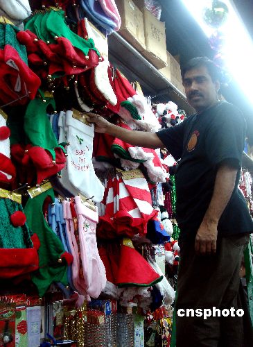 圣誕節(jié)臨近,中國制造的節(jié)日飾品在紐約陸續(xù)登場。圖為位于紐約曼哈頓中城一家商店的店員忙于上貨,這位店員表示,這些飾品都是中國制造。中新社發(fā) 譚宏偉 攝