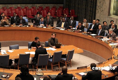 聯(lián)合國安理會二十七日就威脅國際和平與安全的恐怖主義問題舉行緊急磋商,并通過主席聲明,用“最強烈的字眼”譴責(zé)當(dāng)日早些時候發(fā)生在巴基斯坦的致使貝·布托遇害身亡的恐怖襲擊事件。中新社發(fā) 李靜 攝