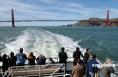3月初的美國(guó)舊金山陽(yáng)光明媚,大批游客乘坐旅游船觀賞金門(mén)大橋的雄姿。首批中國(guó)赴美旅游團(tuán)有望在今年夏天成行,中國(guó)內(nèi)地旅游社已著手設(shè)計(jì)赴美旅游線(xiàn)路,其中擁有廣泛知名度的舊金山金門(mén)大橋?qū)⒊蔀楸剡x景點(diǎn)。中新社發(fā) 張煒 攝