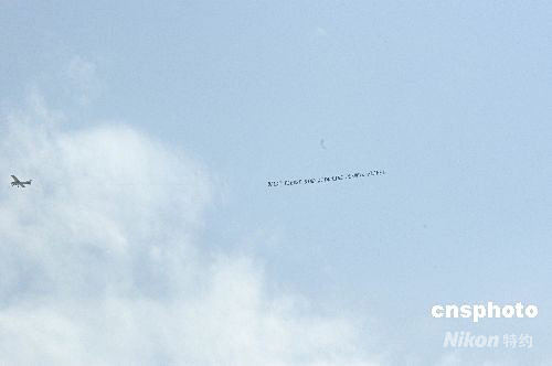 當(dāng)?shù)貢r(shí)間四月二十日,美國(guó)密歇根州華人華僑在密歇根大學(xué)所在城市安娜堡舉行聲勢(shì)浩大的援奧運(yùn)反暴力和平集會(huì)。當(dāng)?shù)厝A商租用了小型飛機(jī),在集會(huì)活動(dòng)的上空拖出一條巨幅抗議標(biāo)語:“達(dá)賴,請(qǐng)你停止攻擊奧運(yùn)圣火。”中新社發(fā) 鄧悅 攝