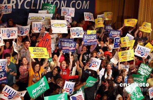 前美國第一夫人希拉里4月22日在賓夕法尼亞州贏得民主黨總統(tǒng)侯選人提名戰(zhàn)的一場關鍵性勝利。圖為希拉里的支持者在費城舉行的慶功會上歡呼慶祝。中新社發(fā) 李靜 攝