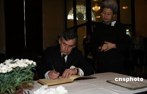 當?shù)?月20日下午,英國首相布朗來到中國駐英大使館,吊唁四川大地震的遇難者。圖為布朗首相在吊唁簿上留言。中新社發(fā) 洪濤 攝