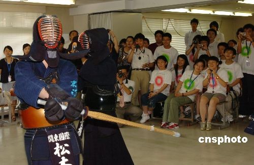 7月25日下午,“中國(guó)學(xué)生索尼訪日代表團(tuán)”一行三十名高中生來(lái)到位于東京的關(guān)東國(guó)際高校進(jìn)行交流。在將近兩個(gè)小時(shí)的時(shí)間里,中日兩國(guó)高中生共同進(jìn)行了歌曲演唱、民樂(lè)演奏、舞蹈表演等形式的文藝表演,一起做游戲,用英、日、中文進(jìn)行交流。日本學(xué)生更通過(guò)茶道、劍道表演和夏季和服展示,向遠(yuǎn)道而來(lái)的客人介紹日本傳統(tǒng)文化。圖為日本同學(xué)在進(jìn)行劍道表演。中新社發(fā) 朱沿華 攝