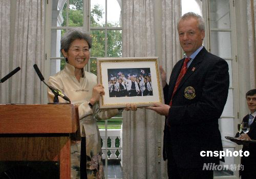 當(dāng)?shù)貢r(shí)間17日晚,中國(guó)駐英使館在倫敦文華東方酒店舉辦招待會(huì),慶祝北京奧運(yùn)會(huì)和殘奧會(huì)的閉幕。圖為中國(guó)駐英大使傅瑩(左)向英國(guó)奧委會(huì)首席執(zhí)行官西蒙·克萊格贈(zèng)送英國(guó)隊(duì)進(jìn)入鳥(niǎo)巢體育場(chǎng)時(shí)的照片。 中新社發(fā) 李鵬 攝