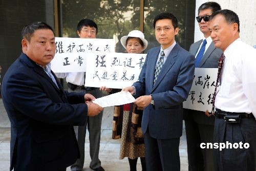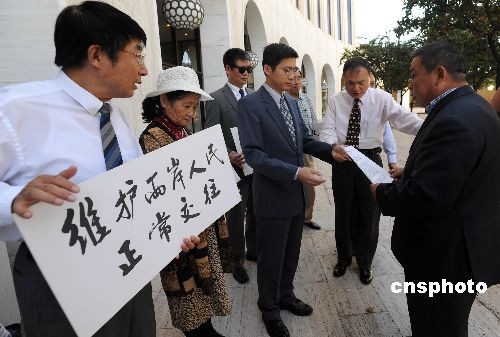 當(dāng)?shù)貢r(shí)間十月二十二日,南加州中國和平統(tǒng)一促進(jìn)會(huì)聯(lián)盟主席周德昭將一封抗議信交付“駐洛杉磯臺(tái)北經(jīng)濟(jì)文化辦事處”代表?xiàng)罟獗。這份由當(dāng)?shù)囟鄠(gè)華人社團(tuán)聯(lián)名的抗議信稱,大陸海協(xié)會(huì)副會(huì)長張銘清在臺(tái)南遭民進(jìn)黨極端分子暴力攻擊事件震驚海外華人社會(huì),華人社團(tuán)嚴(yán)厲譴責(zé)極端分子的野蠻暴力行徑,強(qiáng)烈要求馬英九政府嚴(yán)懲肇事者。中新社發(fā) 張煒 攝