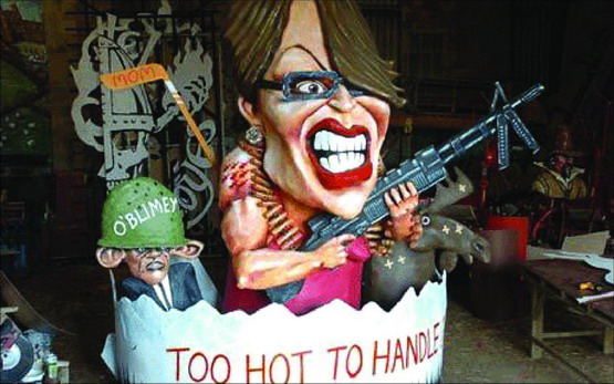 這位阿拉斯加州州長(zhǎng)的巨型肖像頗為夸張:她手握一挺機(jī)槍,兩臂肌肉發(fā)達(dá)而強(qiáng)健,嘴唇上涂抹著濃艷的口紅,還露出了惡作劇式的微笑。她的身邊還立著一只美國(guó)駝鹿雕塑,身前的標(biāo)語(yǔ)上寫(xiě)著“燙手山芋”的字樣。在佩林雕像的旁邊,是民主黨總統(tǒng)候選人奧巴馬的一個(gè)小號(hào)雕像,他頭戴一頂戰(zhàn)斗鋼盔,顯得大為遜色。盡管下著傾盆大雨,里面填滿了煙花的佩林雕像被引爆后,瞬間就炸得灰飛煙滅。