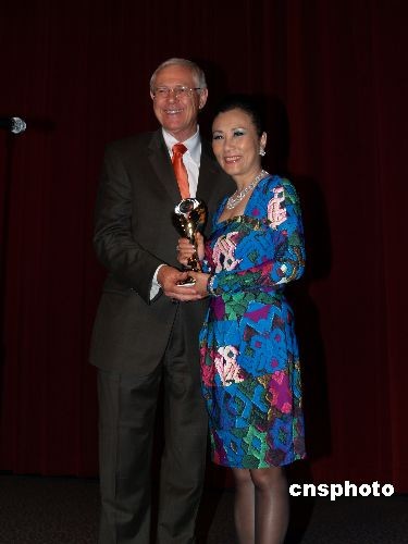 當?shù)貢r間11月4日,中美電影節(jié)在美國洛杉磯好萊塢盛大開幕,1百多部中國和美國電影參加競選,評選出45部中美電影,再從中選出10部電影,頒發(fā)“金天使獎”。中美電影明星齊集好萊塢,1000多人參加。洛杉磯縣政委員安東諾奇向香港影視紅星汪明荃頒“香港藝人杰出貢獻獎”。中新社發(fā) 盧威 攝