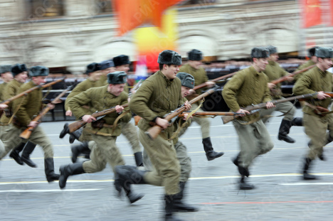 11月7日,俄羅斯士兵身著二戰(zhàn)時(shí)期樣式的軍裝在莫斯科紅場(chǎng)參加閱兵儀式,紀(jì)念1941年11月7日的紅場(chǎng)閱兵式舉行67周年。1941年11月7日,在德國(guó)法西斯軍隊(duì)兵臨莫斯科城下之際,蘇聯(lián)軍隊(duì)在紅場(chǎng)上舉行了閱兵式,紀(jì)念十月革命24周年。參加閱兵式的部隊(duì)在閱兵完畢后直接開(kāi)赴前線同入侵的法西斯德軍作戰(zhàn)。