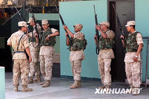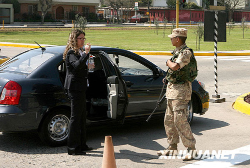 11月16日,在秘魯首都利馬的亞太經合組織(APEC)領導人非正式會議國際新聞中心,執(zhí)勤士兵檢查槍械。秘魯軍方日前在利馬部署了近一萬名士兵,以確保將于11月22日至23日舉行的APEC第十六次領導人非正式會議安全舉行。