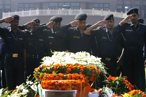 29日,數(shù)名印度國家安全衛(wèi)隊的突擊隊員向在孟買恐怖襲擊案中犧牲的隊友敬禮。在持續(xù)兩天多的印度孟買連環(huán)恐怖襲擊案中,至少造成195人死亡,其中包括22名非印度籍人士,另有近300人受傷。