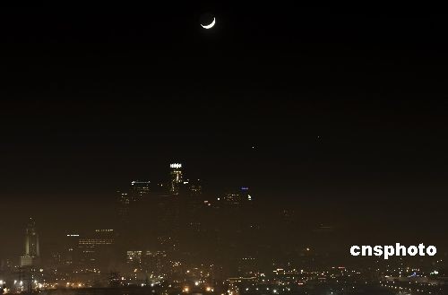 當(dāng)?shù)貢r間十二月一日晚七時許,洛杉磯市中心上空西南方出現(xiàn)“雙星拱月”的少見天象,耀眼的金星(左)和明亮的木星(右)伴隨著一彎新月在夜空中格外醒目。據(jù)天文學(xué)家介紹,這三個天體盡管每年有一次相遇的機(jī)會,但肉眼可見的時候卻很少。中新社發(fā) 張煒 攝