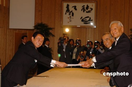 12月8日下午,日本首相麻生太郎在位于東京的首相官邸會(huì)見了新一屆中日友好21世紀(jì)委員會(huì)的中日兩國(guó)委員并接受了該委員會(huì)提交的最終工作報(bào)告。圖為中方首席委員鄭必堅(jiān)和日方首席委員小林陽(yáng)太郎共同向麻生首相提交工作報(bào)告。中新社發(fā) 朱沿華 攝