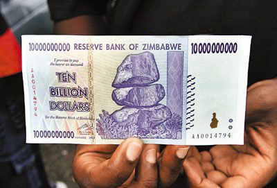 津巴布韋政局動(dòng)蕩,經(jīng)濟(jì)惡化和嚴(yán)重通脹,央行前日起正式發(fā)行面額為10億、50億和100億的新鈔,創(chuàng)下世界之最。該國(guó)一周前才發(fā)行了面額1千萬(wàn)、5千萬(wàn)和1億的3種新鈔。