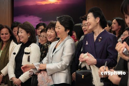 圖為日本前首相福田康夫的夫人福田貴代子與日本參議院女議員高木美智代等在招待會上。