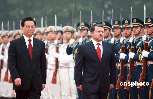 十月三十日,中國國家主席胡錦濤在北京人民大會(huì)堂東門外廣場(chǎng)舉行儀式歡迎約旦國王阿卜杜拉二世·本·侯賽因。中新社發(fā) 廖文靜 攝