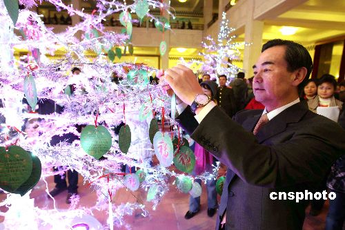 一月二十四日,中國外交部等在北京人民大會堂舉辦慰問駐外外交人員暨親屬春節(jié)聯(lián)歡會,為他們帶去節(jié)日最真誠的祝福。圖為外交部副部長王毅將祝?☉覓煸谧8渖。中新社發(fā) 任海霞 攝