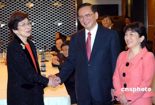 2月21日上午,正在日本進(jìn)行正式訪問的中國國務(wù)委員唐家璇在東京會見日本社民黨黨首福島瑞穗等社民黨主要成員。圖為唐家璇與福島瑞穗(右)、社民黨名譽(yù)黨首土井多賀子(左)握手寒暄。中新社發(fā) 滕劍峰 攝