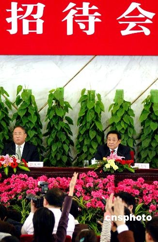 3月11日,十一屆全國人大一次會議新聞發(fā)布會在北京人民大會堂舉行。國家發(fā)展和改革委員會副主任解振華(左)、國家環(huán)境保護(hù)總局副局長張力軍,就環(huán)境資源、節(jié)能減排、2008奧運(yùn)期間北京空氣質(zhì)量等問題回答記者提問。中新社發(fā) 王東明 攝