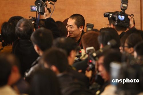 3月12日,全國政協(xié)十一屆一次會議記者招待會在北京人民大會堂新聞發(fā)布廳舉行,主題是“政協(xié)委員談奧運”。著名導(dǎo)演、北京奧組委開幕式總導(dǎo)演張藝謀在發(fā)布會結(jié)束后被媒體重重包圍,難于脫身。中新社發(fā) 盛佳鵬 攝