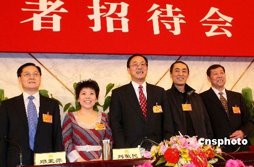 3月12日,全國(guó)政協(xié)十一屆一次會(huì)議記者招待會(huì)在北京人民大會(huì)堂新聞發(fā)布廳舉行,主題是“政協(xié)委員談奧運(yùn)”。北京市副市長(zhǎng)、北京奧組委執(zhí)行副主席劉敬民(左三),國(guó)家體育總局副局長(zhǎng)崔大林(右一),科技日?qǐng)?bào)社社長(zhǎng)張景安(左一),著名導(dǎo)演、北京奧組委開幕式總導(dǎo)演張藝謀(右二),前乒乓球世界冠軍、北京奧組委奧運(yùn)村部副部長(zhǎng)鄧亞萍(左二)等五位全國(guó)政協(xié)委員出席記者招待會(huì),并回答記者問題。中新社發(fā) 盛佳鵬 攝