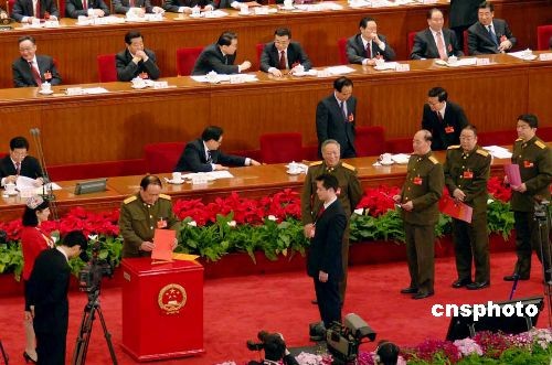 三月十五日上午,十一屆全國人大一次會(huì)議第五次全體會(huì)議在北京人民大會(huì)堂舉行,表決關(guān)于批準(zhǔn)國務(wù)院機(jī)構(gòu)改革方案的決定草案,選舉十一屆全國人大常委會(huì)委員長(zhǎng)、副委員長(zhǎng),選舉國家主席、副主席及中央軍委主席等。中新社發(fā) 王東明 攝