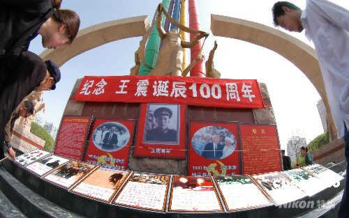 4月11日下午,是王震同志誕辰100周年紀(jì)念日。新疆巴州紅色收藏家陳伯壽在庫爾勒人民廣場(chǎng)免費(fèi)展出王震圖片和資料。當(dāng)日,新疆各地州舉辦座談會(huì)、展出王震圖片和資料等形式紀(jì)念王震同志誕辰100周年。中新社發(fā) 確·胡熱 攝