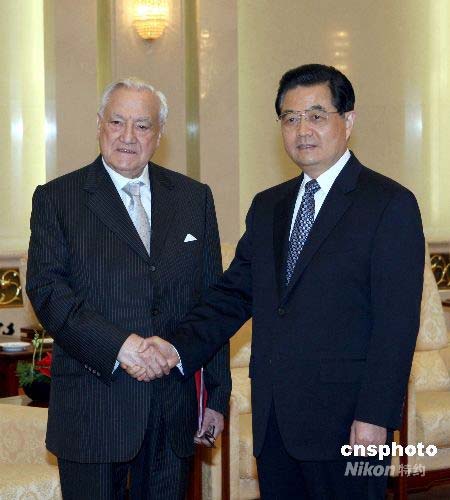 四月二十四日,中國國家主席胡錦濤在北京人民大會堂會見來華訪問的法國參議院議長蓬斯萊一行。中新社發(fā) 任海霞 攝