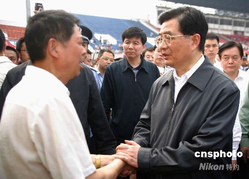 5月16日15時(shí),中共中央總書記、國(guó)家主席胡錦濤來到四川綿陽(yáng)市南和體育中心救助站看望受災(zāi)民眾。中新社發(fā) 劉震 攝