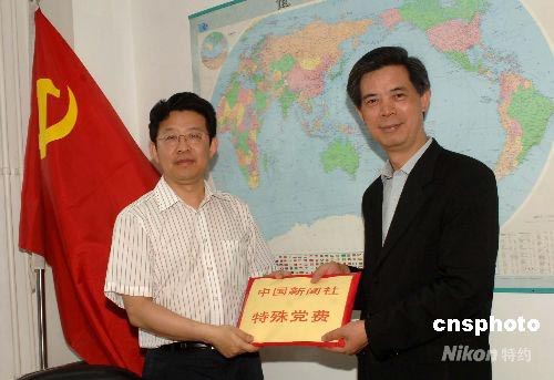 6月3日,中國新聞社社長郭招金(右)將本社全體中共黨員自愿交納的支援四川地震災(zāi)區(qū)特殊黨費(fèi),上交有關(guān)部門。這筆特殊愛心捐款,將轉(zhuǎn)交四川地震災(zāi)區(qū)幫助當(dāng)?shù)厝嗣窨拐鹁葹?zāi)、重建家園。中新社發(fā) 鄒憲 攝