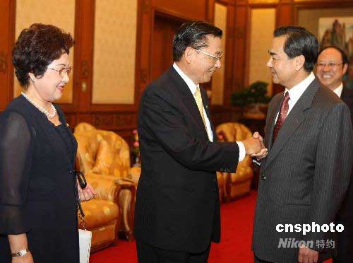 6月12日晚,新任中臺(tái)辦、國(guó)臺(tái)辦主任王毅在北京釣魚臺(tái)會(huì)見(jiàn)并宴請(qǐng)臺(tái)灣海峽交流基金會(huì)董事長(zhǎng)江丙坤一行。中新社發(fā) 任晨鳴 攝