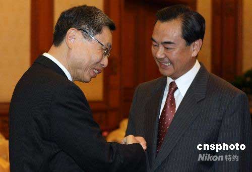 6月12日晚,新任中臺辦、國臺辦主任王毅(右)在北京釣魚臺會見并宴請臺灣海峽交流基金會董事長江丙坤一行。會見時,王毅與;鶗倍麻L高孔廉親切交談。中新社發(fā) 任晨鳴 攝