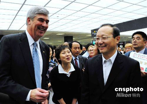 當(dāng)?shù)貢r(shí)間6月17日晚,中國公民赴美旅游首發(fā)團(tuán)抵達(dá)華盛頓杜勒斯國際機(jī)場,中國國家旅游局局長邵琪偉在隨北京團(tuán)抵達(dá)后對記者表示,中美兩國在旅游方面有了很好的旅游機(jī)制,首發(fā)團(tuán)到達(dá)美國,標(biāo)志著中美兩國團(tuán)隊(duì)旅游開始全面啟動。這將對今后中美之間政治、經(jīng)濟(jì)、文化等方面的合作起到積極的推動作用。圖為邵琪偉受到美國商務(wù)部助理部長威廉姆斯·薩頓等熱烈歡迎。中新社發(fā) 邱江波 攝
