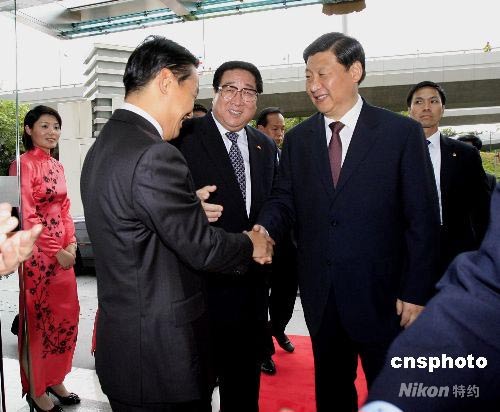 七月七日,中國國家副主席習(xí)近平(右)在中央駐港聯(lián)絡(luò)辦公室接見中央駐港機構(gòu)和中資機構(gòu)負(fù)責(zé)人,中聯(lián)辦主任高祀仁(中)及多位副主任到門口迎接。中新社發(fā) 王麗南 攝