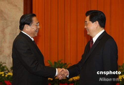 8月7日,中國國家主席胡錦濤在北京人民大會堂會見應(yīng)邀出席北京奧運(yùn)會開幕式的老撾國家主席朱馬里。中新社發(fā) 廖文靜 攝
