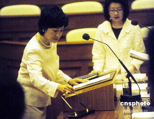 十月八日,香港新一屆立法會舉行首次會議,議員逐一宣誓就職。圖為葉劉淑儀宣誓。中新社發(fā) 譚達(dá)明 攝