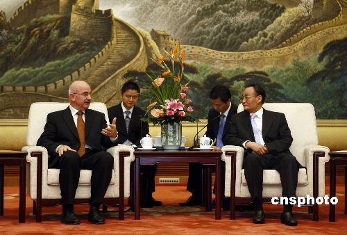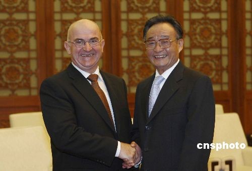 10月15日,中國(guó)全國(guó)人大常委會(huì)委員長(zhǎng)吳邦國(guó)在北京人民大會(huì)堂會(huì)見(jiàn)瑞士聯(lián)邦議會(huì)國(guó)民院議長(zhǎng)布永。中新社發(fā) 盛佳鵬 攝