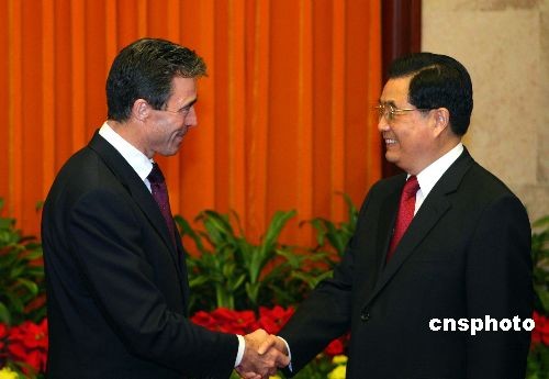 10月22日,中國(guó)國(guó)家主席胡錦濤在北京人民大會(huì)堂會(huì)見(jiàn)前來(lái)出席第七屆亞歐首腦會(huì)議的丹麥?zhǔn)紫嗬鼓律。中新社發(fā) 廖文靜 攝