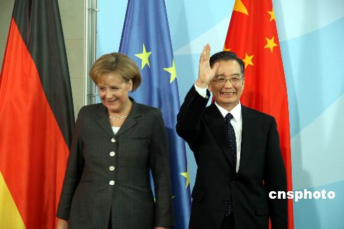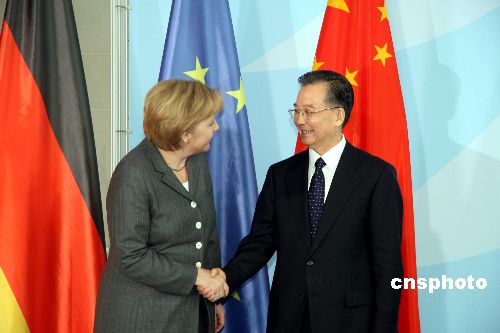 中國國務(wù)院總理溫家寶二十九日在柏林和德國總理默克爾進(jìn)行了會談,中德兩國簽署了共同努力穩(wěn)定世界經(jīng)濟(jì)形勢的聯(lián)合聲明和氣候、交通等合作項(xiàng)目文件。中新社發(fā) 吳衛(wèi)中 攝
