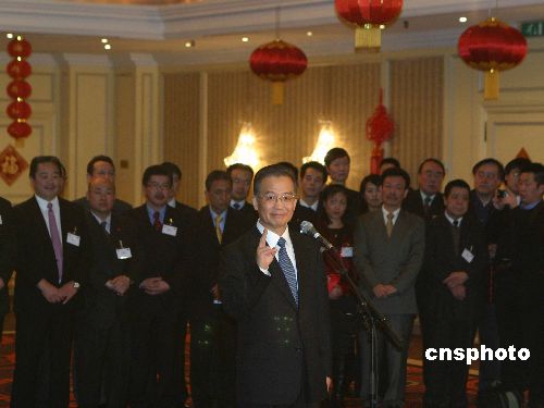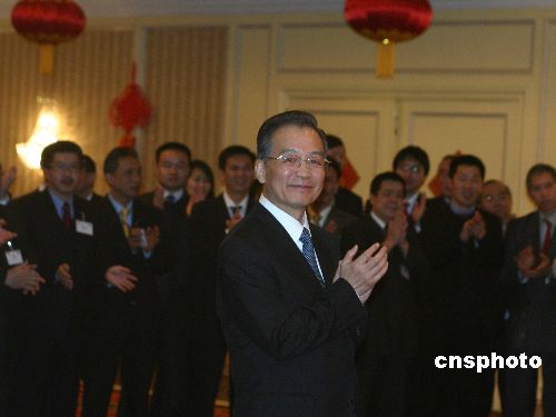 當(dāng)?shù)貢r(shí)間一月二十九日晚,中國(guó)總理溫家寶在結(jié)束對(duì)德國(guó)的訪問(wèn)后飛抵布魯塞爾,并首先看望了中國(guó)駐歐盟的外交官們和當(dāng)?shù)厝A僑華人代表。會(huì)見現(xiàn)場(chǎng)被布置得充滿節(jié)日的喜慶氣氛。溫家寶笑言這次出訪被稱為“急行軍”,自己的時(shí)差也有點(diǎn)沒(méi)倒好。中新社發(fā) 張朔 攝