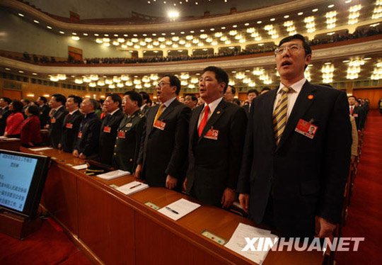 3月3日,中國人民政治協(xié)商會(huì)議第十一屆全國委員會(huì)第二次會(huì)議在北京人民大會(huì)堂開幕,全場齊唱國歌。