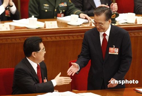 3月5日上午,十一屆全國(guó)人大二次會(huì)議在北京人民大會(huì)堂開(kāi)幕,中國(guó)國(guó)家主席胡錦濤與國(guó)務(wù)院總理溫家寶互致問(wèn)候。中新社發(fā) 盛佳鵬 攝