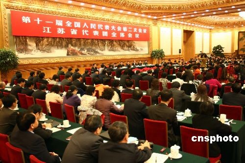 3月7日,全國人大江蘇代表團(tuán)在人民大會(huì)堂舉行全體會(huì)議。中新社發(fā) 杜洋 攝