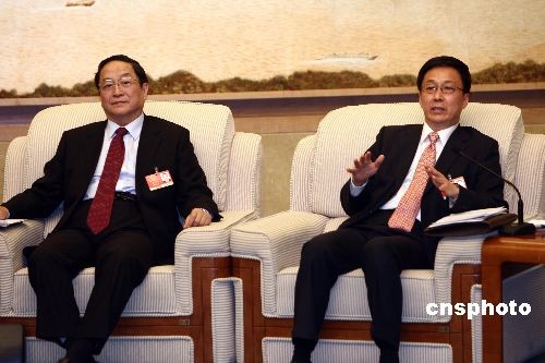 3月7日,全國人大上海代表團在人民大會堂舉行全體會議。上海市委書記俞正聲(左)、市長韓正出席會議。韓正在接受采訪時表示,已向國務院提交在上海成立人民幣結算試點申請,希望能盡快推進。中新社發(fā) 杜洋 攝