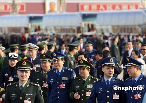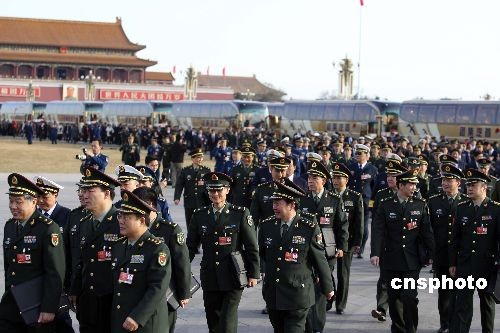 3月9日,十一屆全國人大二次會(huì)議在北京人民大會(huì)堂舉行第二次全體會(huì)議,解放軍代表團(tuán)步入會(huì)場。中新社發(fā) 盛佳鵬 攝