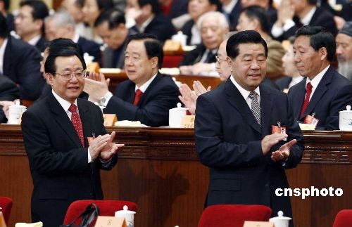 3月9日,全國(guó)政協(xié)十一屆二次會(huì)議在北京人民大會(huì)堂舉行第四次全體會(huì)議。全國(guó)政協(xié)主席賈慶林、副主席王剛步入會(huì)場(chǎng)。中新社發(fā) 盛佳鵬 攝