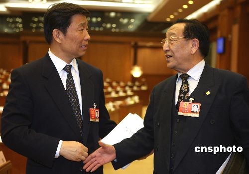 3月12日上午,十一屆全國人大二次會議第三次主席團會議在北京人民大會堂舉行。會議經(jīng)過表決,決定將關于全國人大常委會工作報告的決議草案、關于最高人民法院工作報告的決議草案、關于最高人民檢察院工作報告的決議草案提請各代表團審議。主席團成員李源潮(左)、列確(西藏自治區(qū)人大常委會主任)出席。中新社發(fā) 任晨鳴 攝