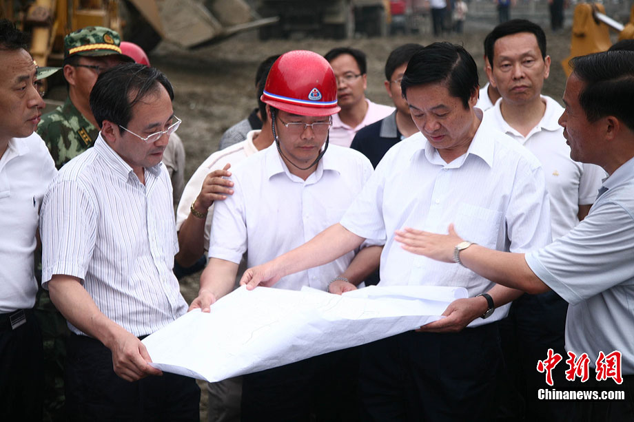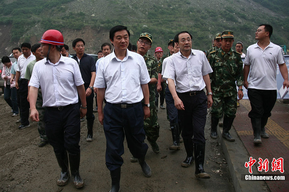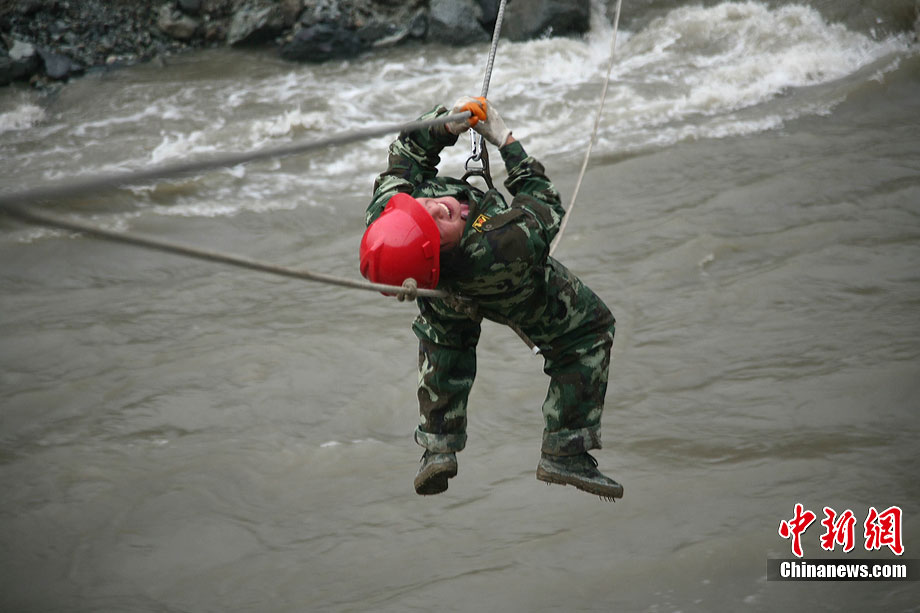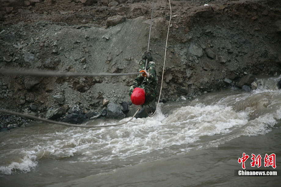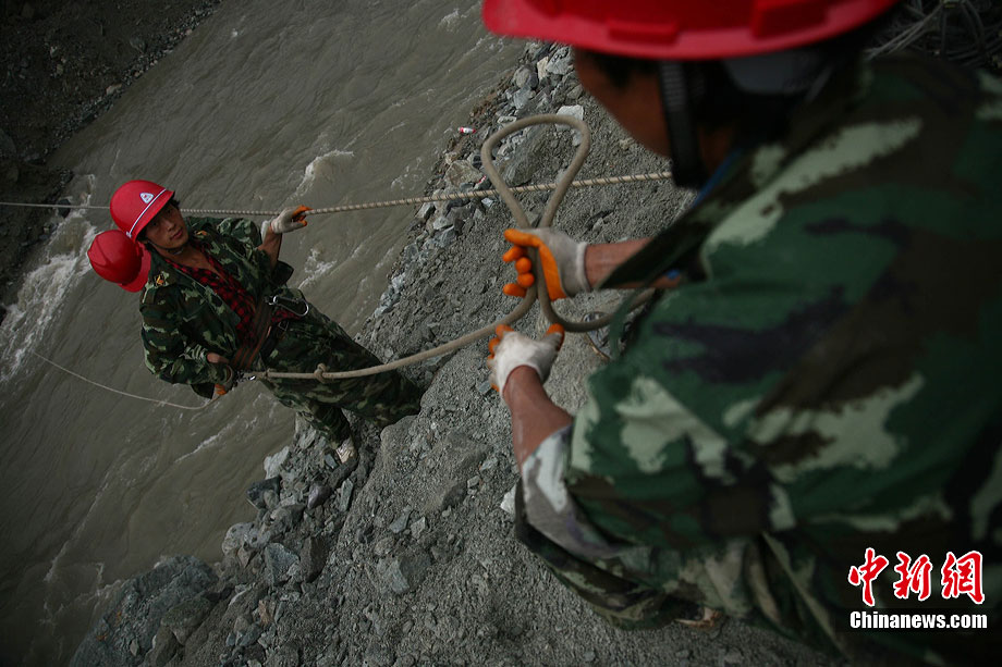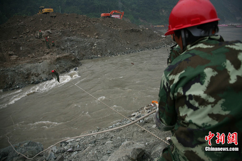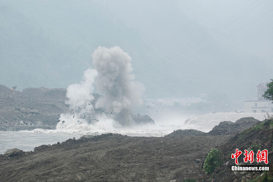 8月17日下午,映秀泥石流搶險救災指揮部對致使岷江改道的堰塞體進行了第二次爆破,由于天氣不甚理想,為了盡快實現(xiàn)岷江河水“回軌”,救援指揮部決定以爆破的方式加快搶險進度。據(jù)爆破現(xiàn)場負責人透露,此次爆破主要是為解決8塊巨石,這些巨石超出了挖掘機的負荷量,必須選擇爆破方式解決。中新社發(fā) 張浪 攝