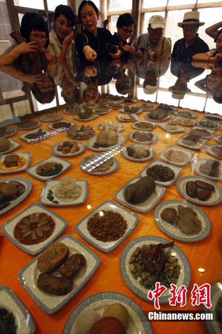8月20日,游客在廣西柳州八桂奇石館欣賞“滿漢全席”。這些栩栩如生的各式奇石酷似美食佳肴,令游客垂涎欲滴。中新社記者 張宇 攝