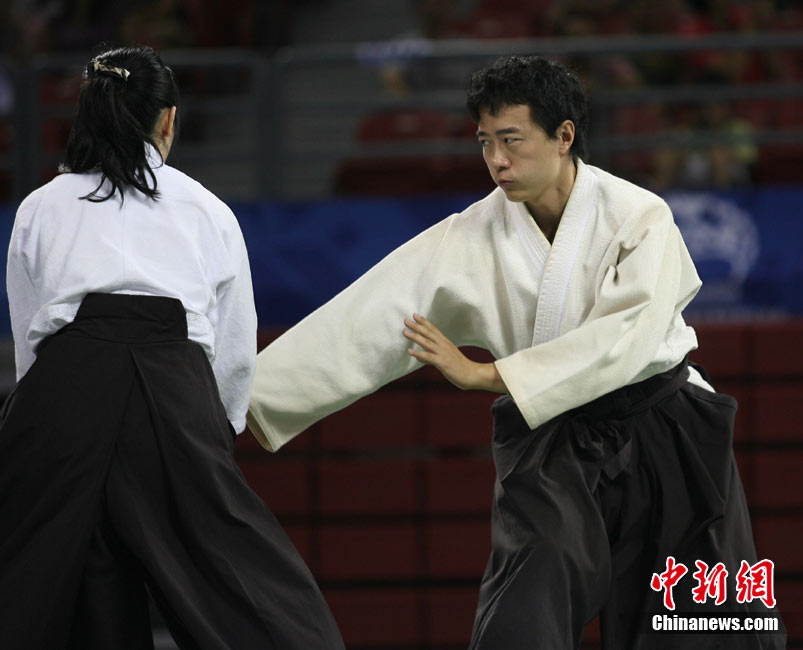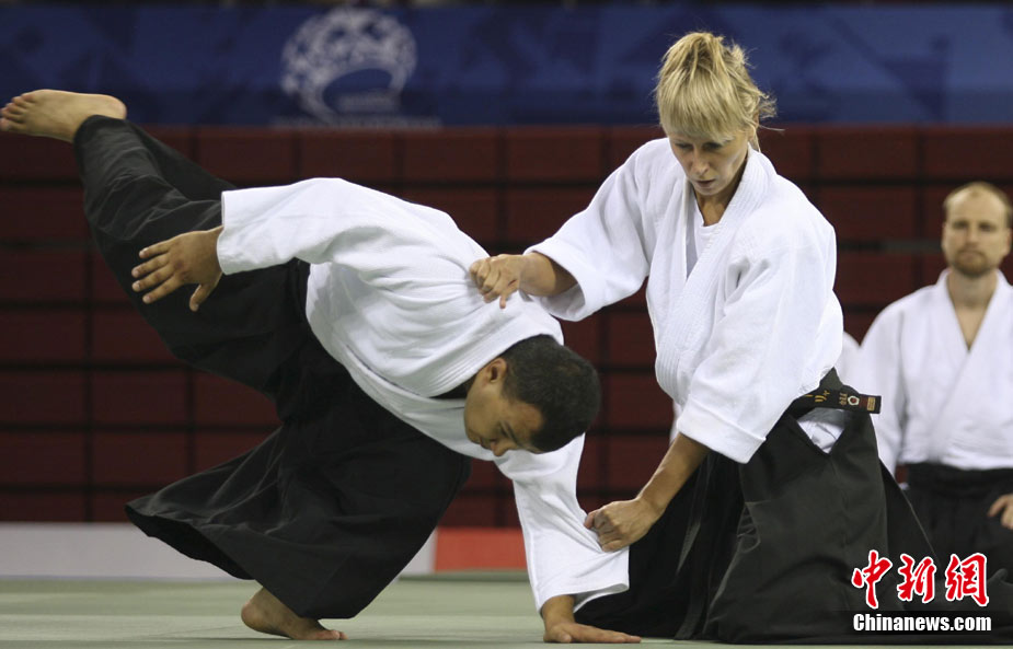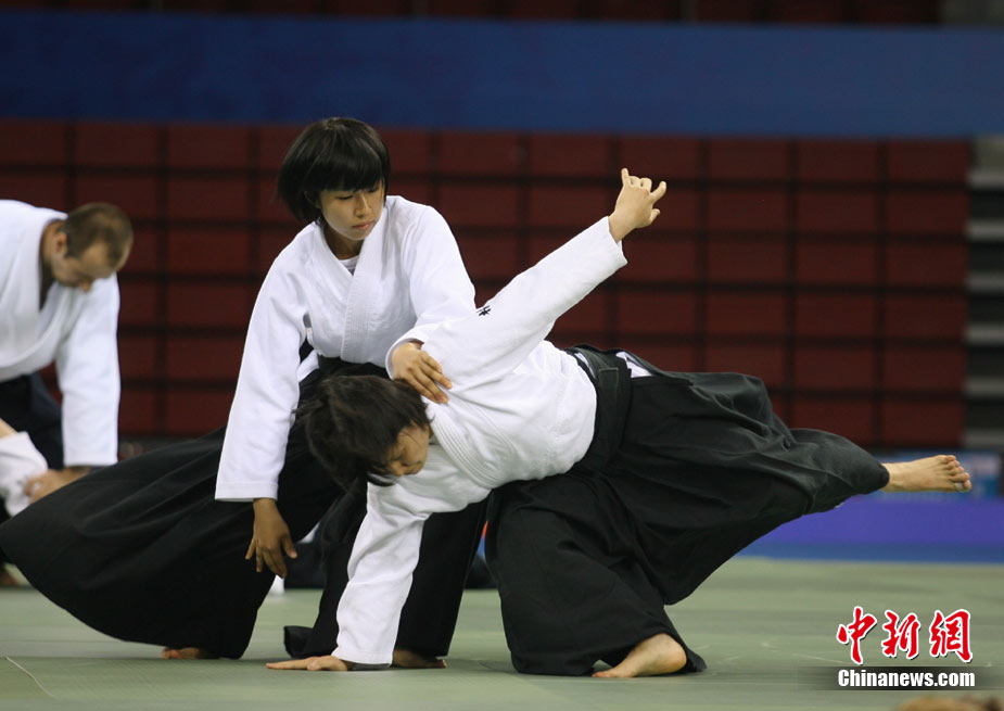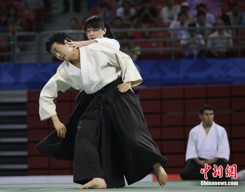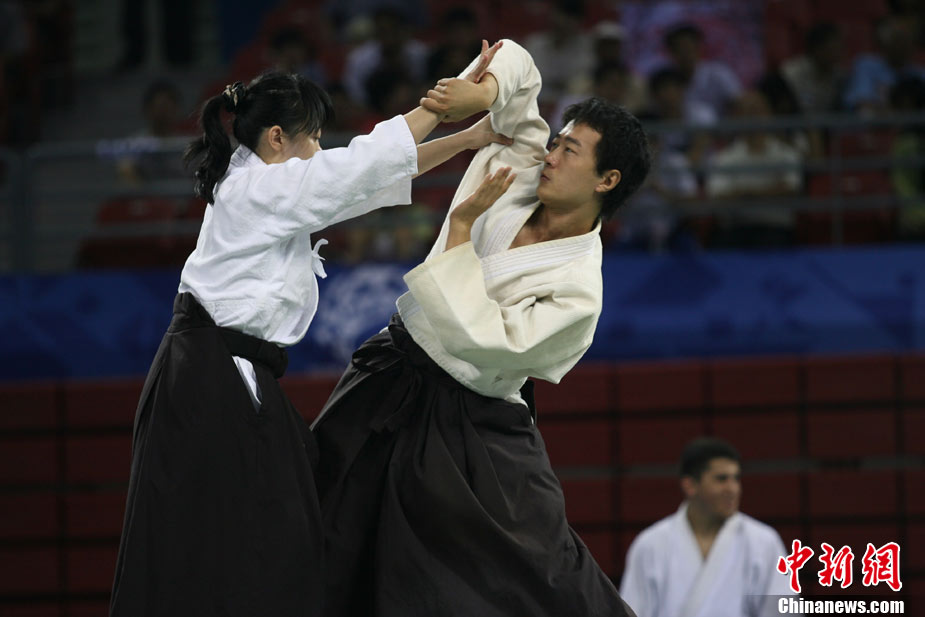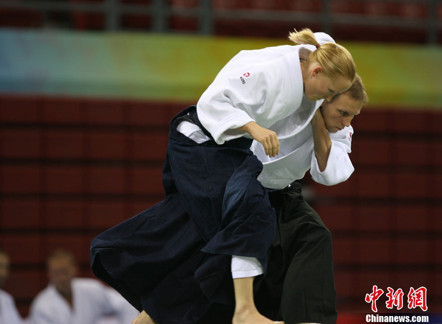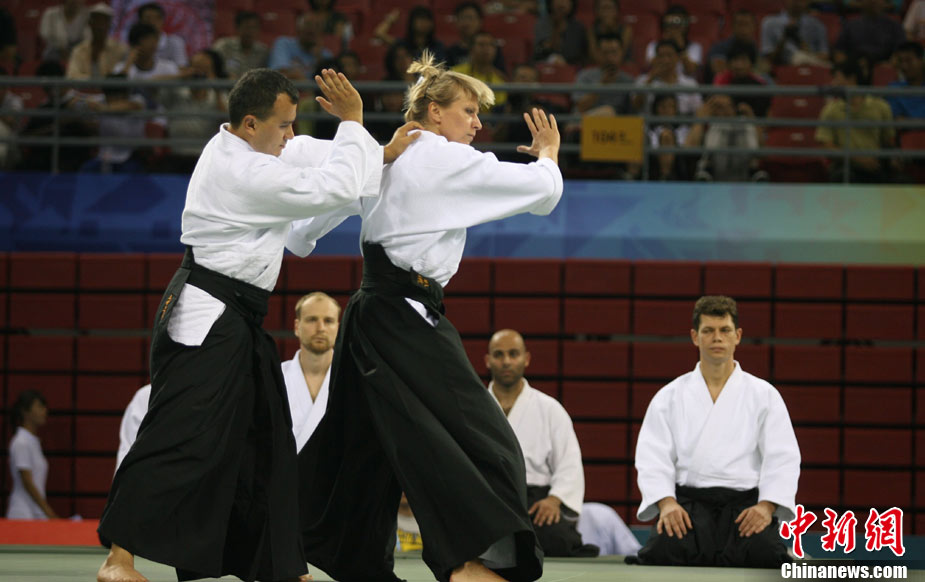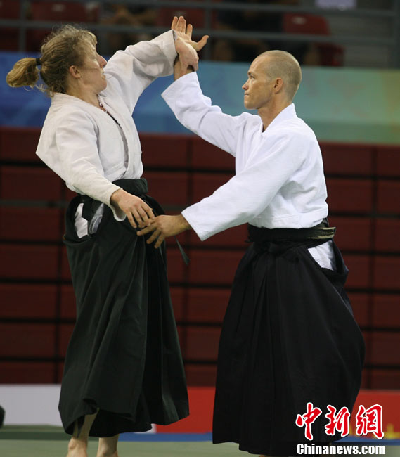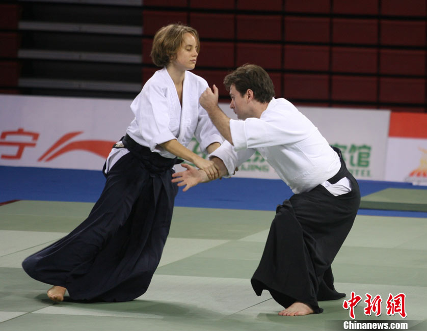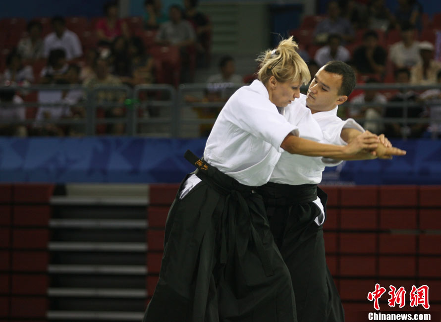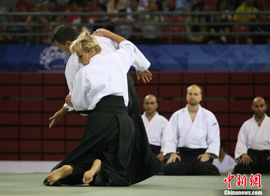 8月30日,男女選手在北京武搏會合氣道比賽上演了“異性對決”。合氣道是一種根源于日本大東流合氣柔術(shù)的近代武術(shù),合氣道不注重比賽的勝負,沒有跟別人較量的思想,而是跟他人一起鍛煉和修養(yǎng)自己,因此才會有鮮見的異性同場對決的場面出現(xiàn)。本次武搏會,合氣道將作為表演項目,無特別的規(guī)則,因此不能夠嚴格地定義勝利者或者失敗者。國際合氣道聯(lián)合會將組織高段教官來評判各項表演,表演賽分為基本技巧、高級技巧和復(fù)合技巧等三個單元。 中新社發(fā) 蘇丹 攝